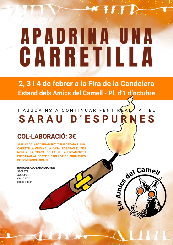Cada carretilla apadrinada et donarà dret a una participació al sorteig i ens ajudarà a continuar fent realitat el Sarau d’Espurnes de la plaça de l’Ajuntament i la plaça de la Creu.